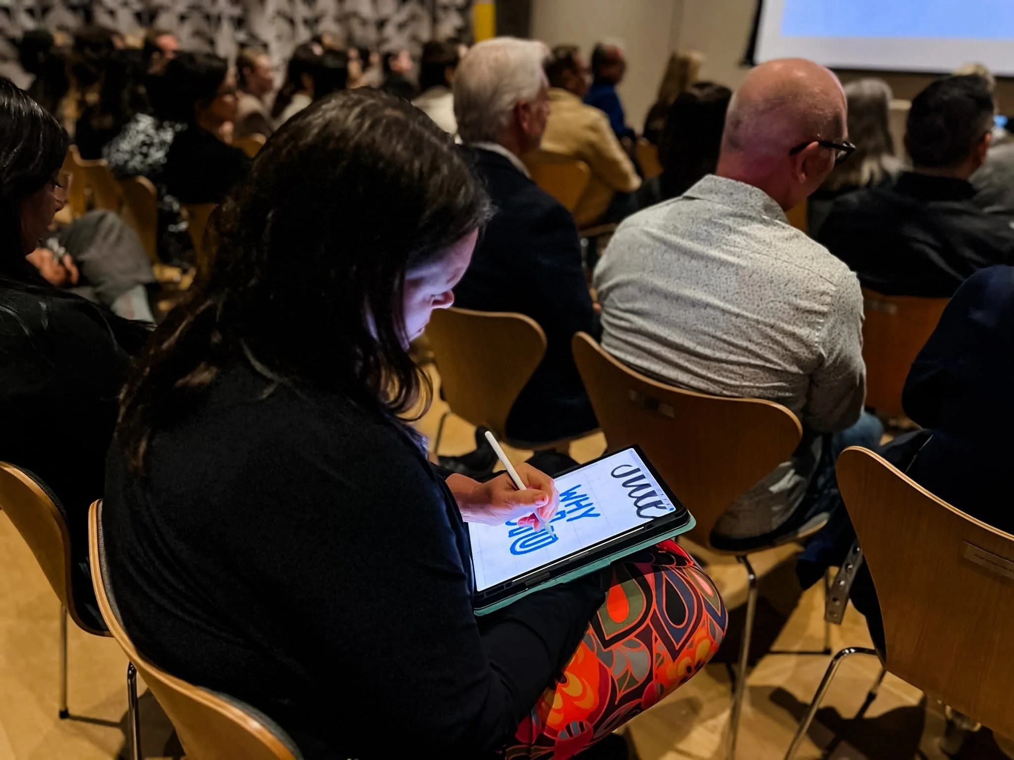 Then you glance to the side. There’s a human standing at a massive board, drawing fast. And somehow, they’re translating everything the speaker is saying into words and images in real time.